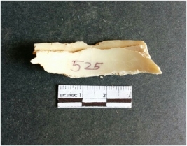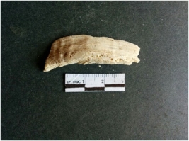 | Description / विवरण | The shell fragment is a small piece, with truncated ends and sharp edges. The piece has natural polish on its inner surface and outer surface has natural rough striations. The piece is pale white in color. The piece is waste material bi - product as a result of shell working at the site. |