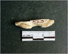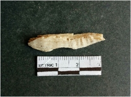 | Description / विवरण | The shell fragment is a small piece, with truncated ends and sharp edges. The piece has natural polish on its inner surface and outer surface has natural rough striations. The piece is pale white in color. The piece is waste material bi - product as a result of shell working at the site. |