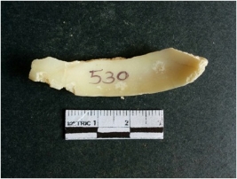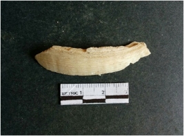 | Description / विवरण | The shell fragment is a small piece, with truncated ends and sharp edges. The piece has natural polish on its inner surface and outer surface has natural rough striations. The piece is pale white in color. The piece is waste material bi - product as a result of shell working at the site. |