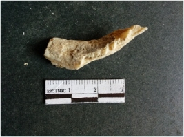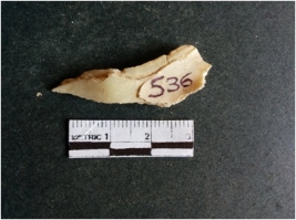 | Description / विवरण | The shell fragment is a small piece, with truncated ends and sharp edges. The piece has natural polish on its inner surface and outer surface has natural rough striations. The piece is pale white in color. The piece is waste material bi - product as a result of shell working at the site. |