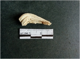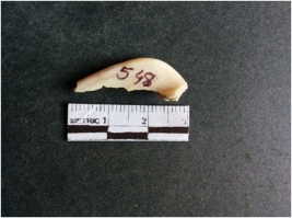 | Description / विवरण | The shell fragment is a small piece, with truncated ends and sharp edges. The piece has natural polish on its inner surface and outer surface has natural rough striations. The piece is pale white in color. The piece is waste material bi - product as a result of shell working at the site. |