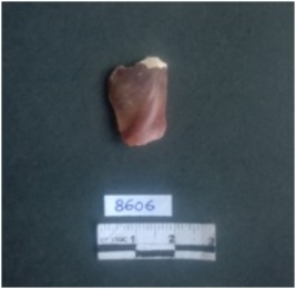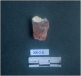| Description / विवरण | This is a chert stone fragment, smooth surface with sharp edges, a small fraction of calcium deposite on one corner, with bulb of percussion and ripples formation on one side, flaked on the other. Marronish in color. |