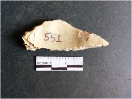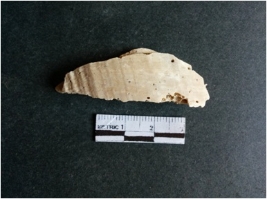 | Description / विवरण | The shell fragment is a small piece, with truncated ends and sharp edges. The piece has natural polish on its inner surface and outer surface has natural rough striations. The piece is pale white in color. The piece is waste material bi - product as a result of shell working at the site. |
