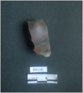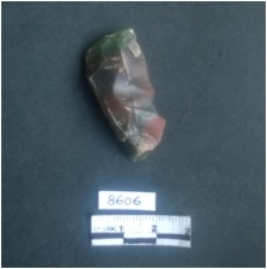 | Description / विवरण | This is a jasper fragment stone, a flaked piece with a striking platform and bulb of percussion with ripples. Flaked removed from the other side, a small fraction of cortex seen. Red with green bands in color and this is an elongated rectangular shaped ribe. |