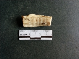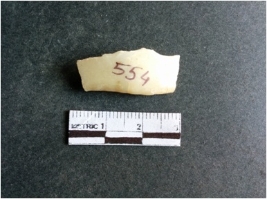 | Description / विवरण | The shell fragment is a small piece, with truncated ends and sharp edges. The piece has natural polish on its inner surface and outer surface has natural rough striations. The piece is pale white in color. The piece is waste material bi - product as a result of shell working at the site. |