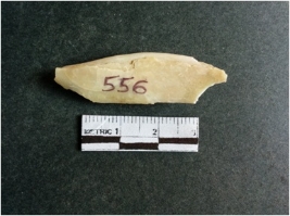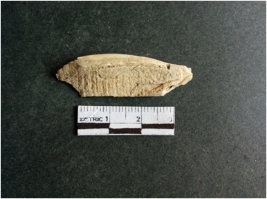 | Description / विवरण | The shell fragment is a small piece, with truncated ends and sharp edges. The piece has natural polish on its inner surface and outer surface has natural rough striations. The piece is pale white in color. The piece is waste material bi - product as a result of shell working at the site. |