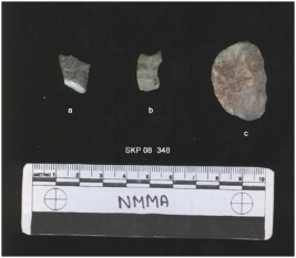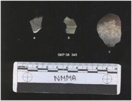 | Description / विवरण | A flaked lithic debitage of jasper with white bands. |