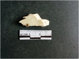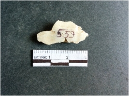 | Description / विवरण | The shell fragment is a small piece, with truncated ends and sharp edges. The piece has natural polish on its inner surface and outer surface has natural rough striations. The piece is pale white in color. The piece is waste material bi - product as a result of shell working at the site. |