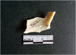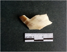 | Description / विवरण | The shell fragment is a small piece, with truncated ends and sharp edges. The piece has natural polish on its inner surface and outer surface has natural rough striations. The piece is pale white in color. The piece is waste material bi - product as a result of shell working at the site. |