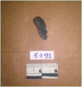 | Description / विवरण | This is a fragment of chert stone. This is a small flake, remembling a blade with a striking platform. Bulb of percussion seen with ripples. Retouched denticulated marks seen on one side. |