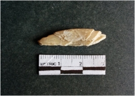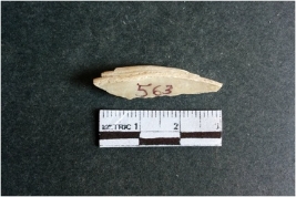 | Description / विवरण | The shell fragment is a small piece, with truncated ends and sharp edges. The piece has natural polish on its inner surface and outer surface has natural rough striations. The piece is pale white in color. The piece is waste material bi - product as a result of shell working at the site. |