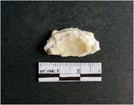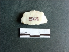 | Description / विवरण | The shell fragment is a small piece, with truncated ends and sharp edges. The piece has natural polish on its inner surface and outer surface has natural rough striations. The piece is pale white in color. The piece is waste material bi - product as a result of shell working at the site. |