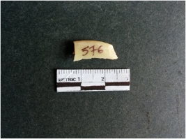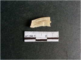 | Description / विवरण | The shell fragment is a small piece, with truncated ends and sharp edges. The piece has natural polish on its inner surface and outer surface has natural rough striations. The piece is pale white in color. The piece is waste material bi - product as a result of shell working at the site. |