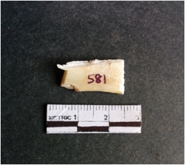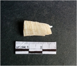 | Description / विवरण | The shell fragment is a small piece, with truncated ends and sharp edges. The piece has natural polish on its inner surface and outer surface has natural rough striations. The piece is pale white in color. The piece is waste material bi - product as a result of shell working at the site. |