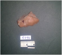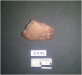 | Description / विवरण | This is a fragment of chert stone. This is a small flake, remembling a blade with a striking platform. Bulb of percussion seen with ripples. Retouched denticulated marks seen on one side. |