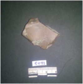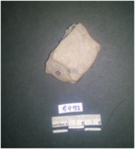 | Description / विवरण | This is a fragment of chert stone. This is a small flake, remembling a blade with a striking platform. Bulb of percussion seen with ripples. Retouched denticulated marks seen on one side. Sharp angular edges due to flaking. |