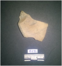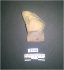 | Description / विवरण | This is a fragment of chert stone. This is a small flake, remembling a blade with a striking platform. Bulb of percussion seen with ripples. Retouched denticulated marks seen on one side. |