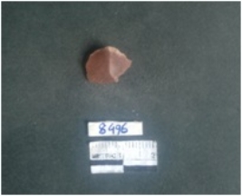 | Description / विवरण | Small fragment of jasper, reddish in color with prominent bulb of percussion and sharp edges. |