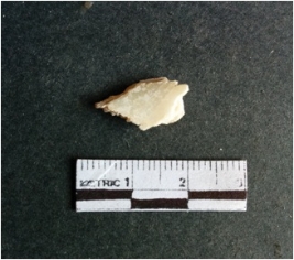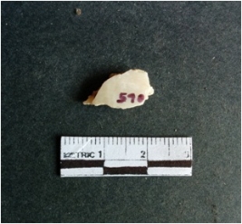 | Description / विवरण | The shell fragment is a small piece, with truncated ends and sharp edges. The piece has natural polish on its inner surface and outer surface has natural rough striations. The piece is pale white in color. The piece is waste material bi - product as a result of shell working at the site. |