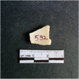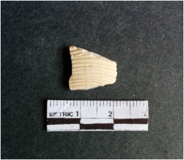 | Description / विवरण | The shell fragment is a small piece, with truncated ends and sharp edges. The piece has natural polish on its inner surface and outer surface has natural rough striations. The piece is pale white in color. The piece is waste material bi - product as a result of shell working at the site. |