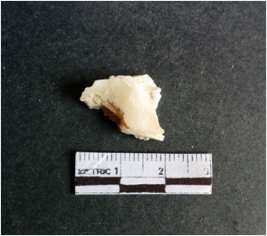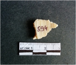 | Description / विवरण | The shell fragment is a small piece, with truncated ends and sharp edges. The piece has natural polish on its inner surface and outer surface has natural rough striations. The piece is pale white in color. The piece is waste material bi - product as a result of shell working at the site. |