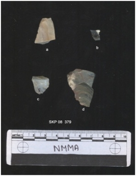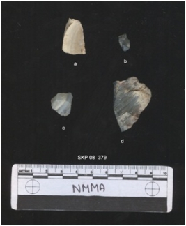 | Description / विवरण | Flaked banded agate, with bulb, grey and red bands. Presence of ripples and flaked ridges. Could be a waste product after manufacturing. |