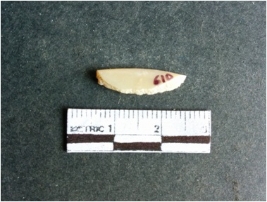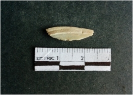 | Description / विवरण | The shell fragment is a small piece, with truncated ends and sharp edges. The piece has natural polish on its inner surface and outer surface has natural rough striations. The piece is pale white in color. The piece is waste material bi - product as a result of shell working at the site. |