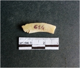 | Description / विवरण | The shell fragment is a small piece, with truncated ends and sharp edges. The piece has natural polish on its inner surface and outer surface has natural rough striations. The piece is pale white in color. The piece is waste material bi - product as a result of shell working at the site. |
