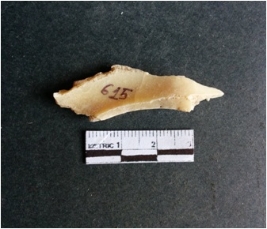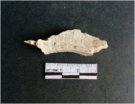 | Description / विवरण | The shell fragment is a small piece, with truncated ends and sharp edges. The piece has natural polish on its inner surface and outer surface has natural rough striations. The piece is pale white in color. The piece is waste material bi - product as a result of shell working at the site. |