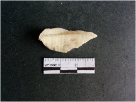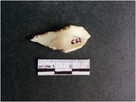 | Description / विवरण | The shell fragment is a small piece, with truncated ends and sharp edges. The piece has natural polish on its inner surface and outer surface has natural rough striations. The piece is pale white in color. The piece is waste material bi - product as a result of shell working at the site. |