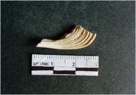 | Description / विवरण | The shell fragment is a small piece, with truncated ends and sharp edges. The piece has natural polish on its inner surface and outer surface has natural rough striations. The piece is pale white in color. The piece is waste material bi - product as a result of shell working at the site. |