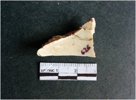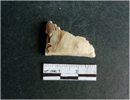 | Description / विवरण | The shell fragment is a small piece, with truncated ends and sharp edges. The piece has natural polish on its inner surface and outer surface has natural rough striations. The piece is pale white in color. The piece is waste material bi - product as a result of shell working at the site. |