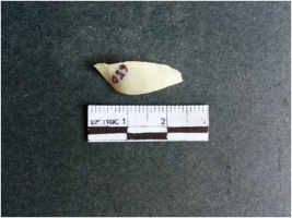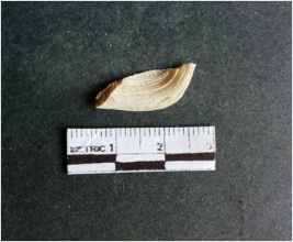 | Description / विवरण | The shell fragment is a small piece, with truncated ends and sharp edges. The piece has natural polish on its inner surface and outer surface has natural rough striations. The piece is pale white in color. The piece is waste material bi - product as a result of shell working at the site. |