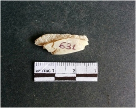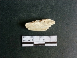 | Description / विवरण | The shell fragment is a small piece, with truncated ends and sharp edges. The piece has natural polish on its inner surface and outer surface has natural rough striations. The piece is pale white in color. The piece is waste material bi - product as a result of shell working at the site. |