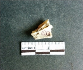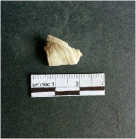 | Description / विवरण | The shell fragment is a small piece, with truncated ends and sharp edges. The piece has natural polish on its inner surface and outer surface has natural rough striations. The piece is pale white in color. The piece is waste material bi - product as a result of shell working at the site. |