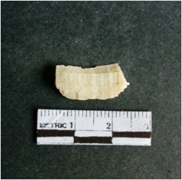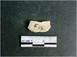 | Description / विवरण | The shell fragment is a small piece, with truncated ends and sharp edges. The piece has natural polish on its inner surface and outer surface has natural rough striations. The piece is pale white in color. The piece is waste material bi - product as a result of shell working at the site. |
