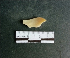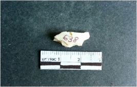 | Description / विवरण | The shell fragment is a small piece, with truncated ends and sharp edges. The piece has natural polish on its inner surface and outer surface has natural rough striations. The piece is pale white in color. The piece is waste material bi - product as a result of shell working at the site. |