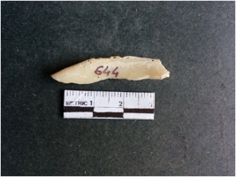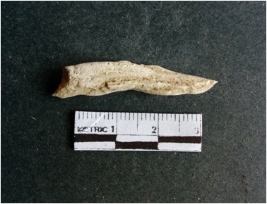 | Description / विवरण | The shell fragment is a small piece, with truncated ends and sharp edges. The piece has natural polish on its inner surface and outer surface has natural rough striations. The piece is pale white in color. The piece is waste material bi - product as a result of shell working at the site. |