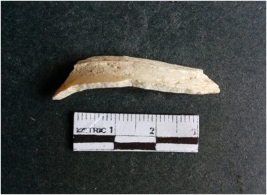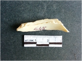 | Description / विवरण | The shell fragment is a small piece, with truncated ends and sharp edges. The piece has natural polish on its inner surface and outer surface has natural rough striations. The piece is pale white in color. The piece is waste material bi - product as a result of shell working at the site. |