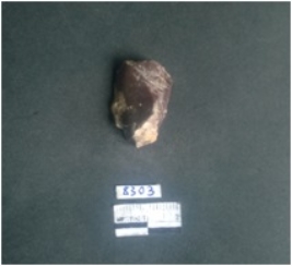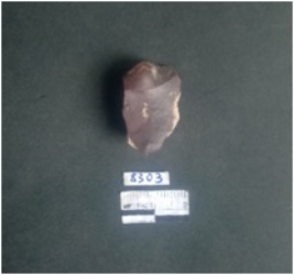 | Description / विवरण | Chert stone flake with flakes removed, marronish in color with surfacial impurities and striking platform. |