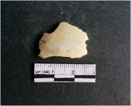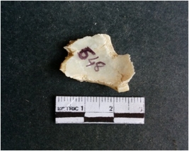 | Description / विवरण | The shell fragment is a small piece, with truncated ends and sharp edges. The piece has natural polish on its inner surface and outer surface has natural rough striations. The piece is pale white in color. The piece is waste material bi - product as a result of shell working at the site. |
