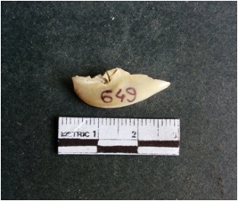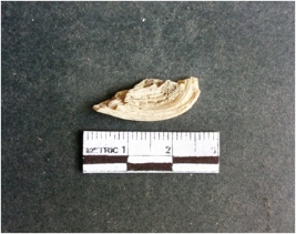 | Description / विवरण | The shell fragment is a small piece, with truncated ends and sharp edges. The piece has natural polish on its inner surface and outer surface has natural rough striations. The piece is pale white in color. The piece is waste material bi - product as a result of shell working at the site. |