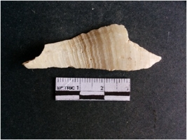| Description / विवरण | The shell fragment is a small piece, with truncated ends and sharp edges. The piece has natural polish on its inner surface and outer surface has natural rough striations. The piece is pale white in color. The piece is waste material bi - product as a result of shell working at the site. |