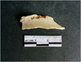 | Description / विवरण | The shell fragment is a small piece, with truncated ends and sharp edges. The piece has natural polish on its inner surface and outer surface has natural rough striations. The piece is pale white in color. The piece is waste material bi - product as a result of shell working at the site. |