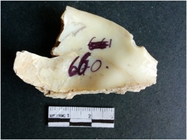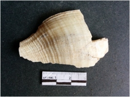 | Description / विवरण | The shell fragment is a small piece, with truncated ends and sharp edges. The piece has natural polish on its inner surface and outer surface has natural rough striations. The piece is pale white in color. The piece is waste material bi - product as a result of shell working at the site. |
