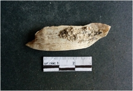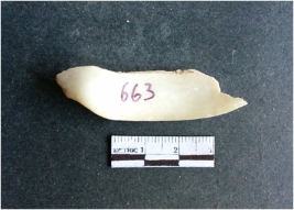 | Description / विवरण | The shell fragment is a small piece, with truncated ends and sharp edges. The piece has natural polish on its inner surface and outer surface has natural rough striations. The piece is pale white in color. The piece is waste material bi - product as a result of shell working at the site. |