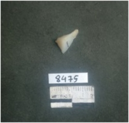 | Description / विवरण | This piece is triangular in shape, milky white in color, one end tappered to a point and sharp sides. |