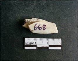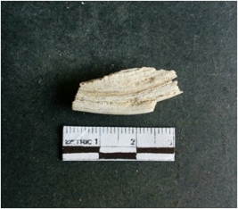 | Description / विवरण | The shell fragment is a small piece, with truncated ends and sharp edges. The piece has natural polish on its inner surface and outer surface has natural rough striations. The piece is pale white in color. The piece is waste material bi - product as a result of shell working at the site. |