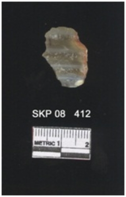 | Description / विवरण | Lithic debitage of chert, it has a striking platform. Some bands lines can be seen on the ventral surface. |