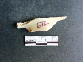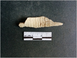 | Description / विवरण | The shell fragment is a small piece, with truncated ends and sharp edges. The piece has natural polish on its inner surface and outer surface has natural rough striations. The piece is pale white in color. The piece is waste material bi - product as a result of shell working at the site. |